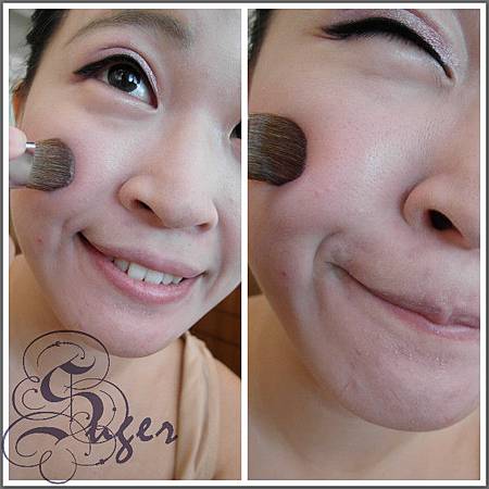 還要拿著粉餅的鏡子,手指頭的食指&中指夾著腮紅,右手 拿刷子補腮紅