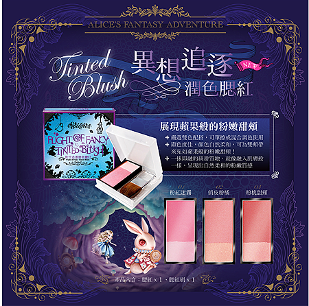 愛麗絲追逐著白兔時,雙頰散發自然紅潤的好臉色,「Solone 異想追逐潤色腮紅」結合故事情節,並精心