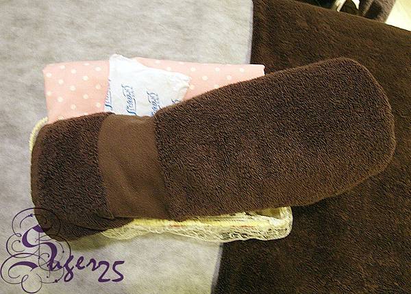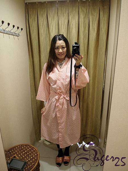 櫃子裡有放浴巾、紙內褲、浴帽、粉色點點浴袍