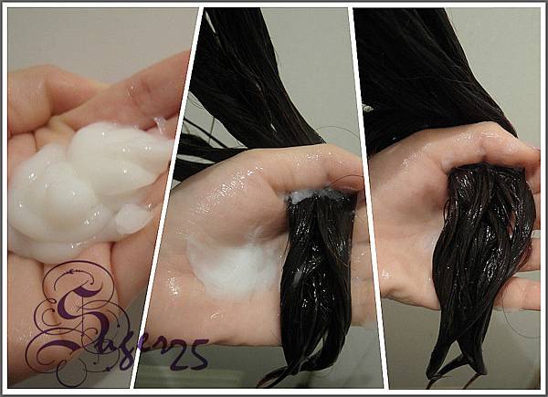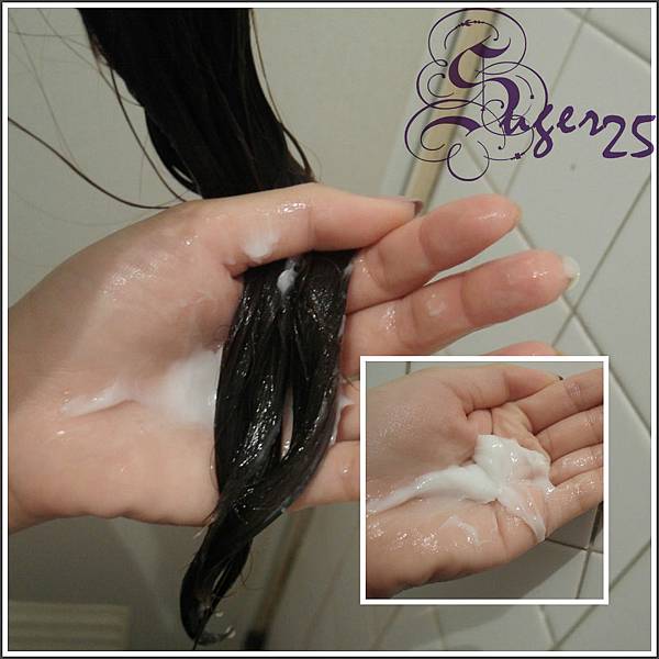 倒出來質地是白色的,比潘婷乳液修護潤髮精華素還要更濃稠一些!