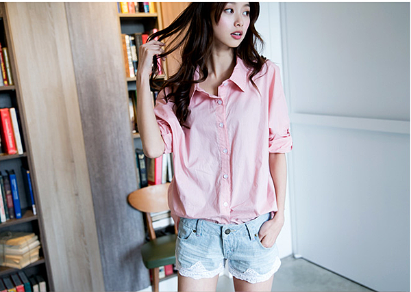 麻豆搭配粉色也好好看,穿上短褲,襯衫紮進去就OK