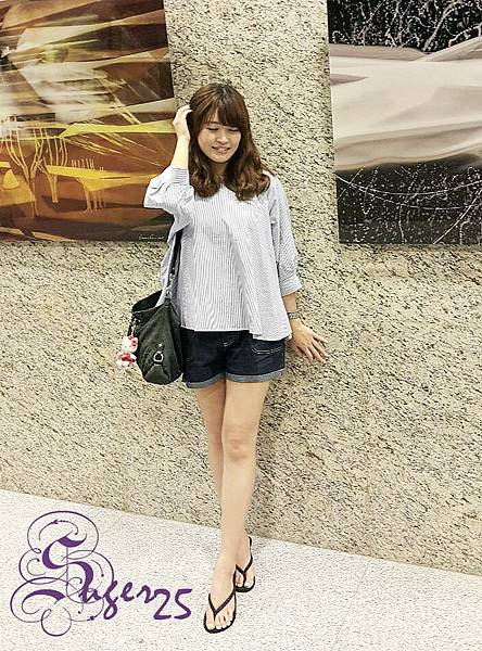 這天~我的穿搭是淺藍色條紋娃娃袖的上衣+寬寬的中高腰牛仔短褲+有點高度的夾腳拖鞋+黑色COACH包包