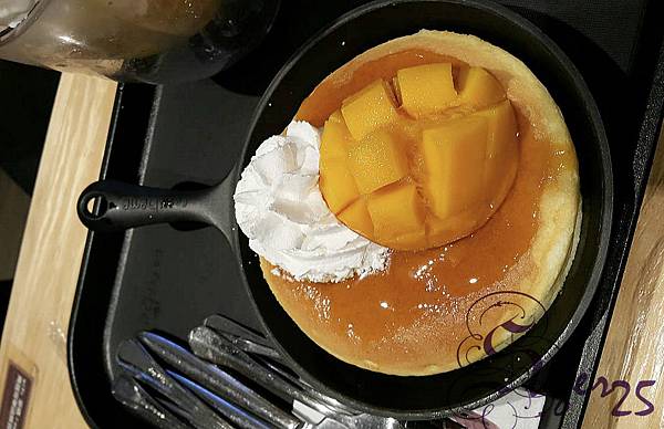 芒果搭配舒芙蕾,很妙的搭配口感,小煎鍋還可以保溫,整個口感不違和好好吃阿~!!