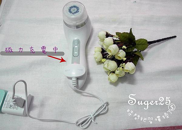 他可是磁力充電器,箭頭處理面有磁鐵可以吸住洗臉機的下方