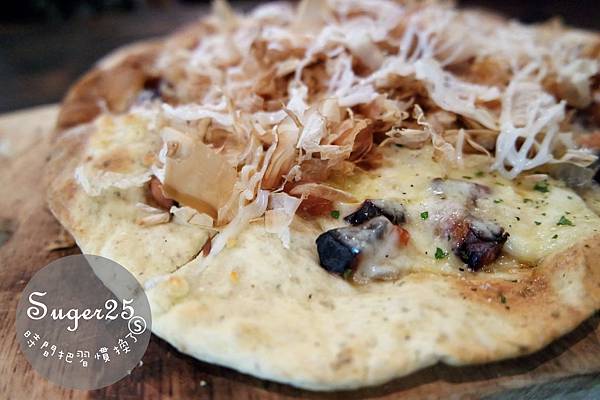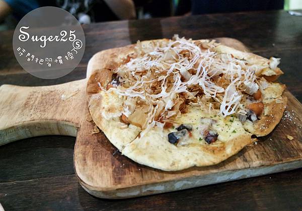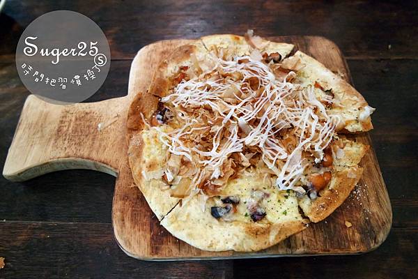 新鮮的柴魚大方地撒上超多在上面,每一塊披薩可以吃到很多的章魚