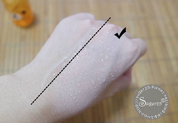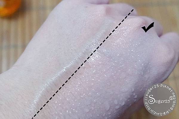 可以看到左邊的水都被皮膚吸收進去了,右邊有擦防曬的地方完成行程一層保護膜