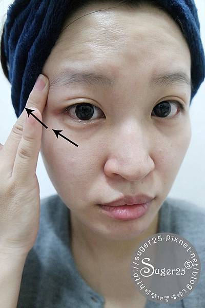 配合眼睛的位子由下往上(眼尾到太陽穴位子)的拉提一下,但力道要注意,不能太用力
