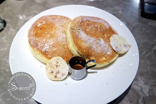 上面煎的微焦還有些許的焦糖&糖粉搭配一丁點的檸檬皮吧!去點綴