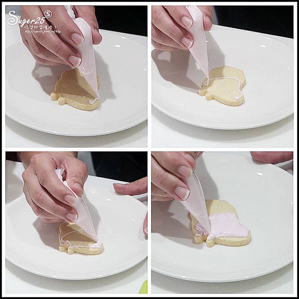 這種裝飾的蛋白糖霜會比要畫的來的硬一點,很快就乾就可以放在餅乾上當裝飾品