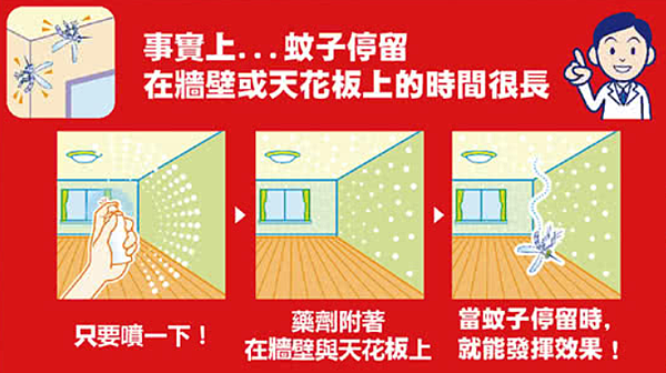 滅蚊成分會附著在天花板和牆壁上,不是散在空氣中,所以不太會吸入人體,寶寶在房間也可以安心使用