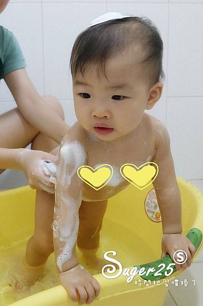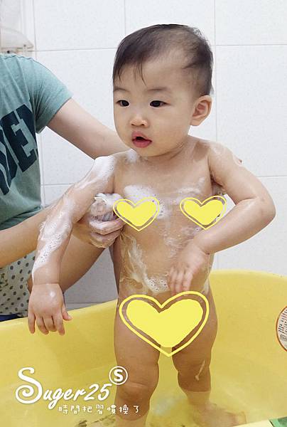 我將沐浴露擠在寶寶專用洗澡海綿上,再加點水搓揉~就會有綿密的泡沫了