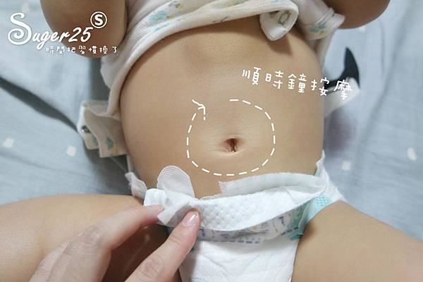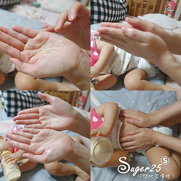 可以先直接擦自寶寶肚子上,寶寶情緒許可時,可以搭配順時鐘用指腹按摩