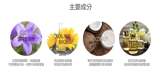 主要成分與洗髮泡泡同系列一樣有花草、向日葵籽油、椰子天然泡沫、白芒花籽油萃取:))