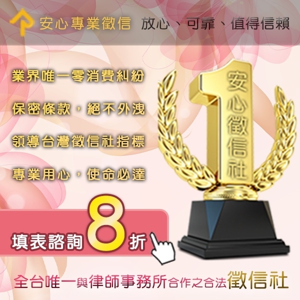 安心徵信公司擁有全台灣唯一與律師合作且絕無消費糾紛、絕不加收費用的誠信徵信公司美譽。