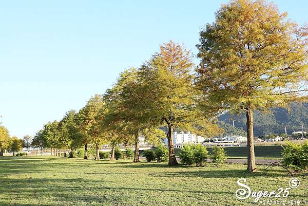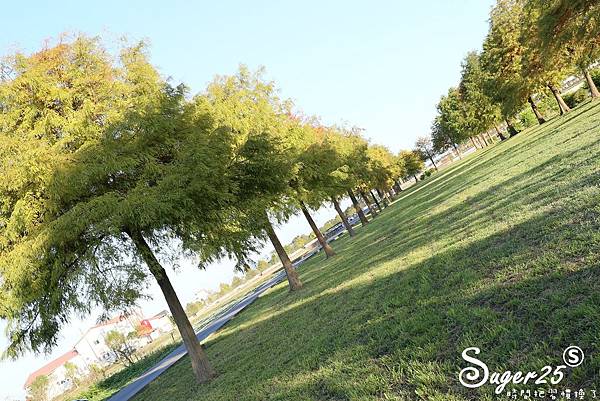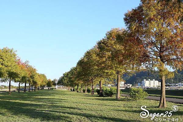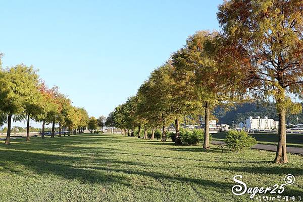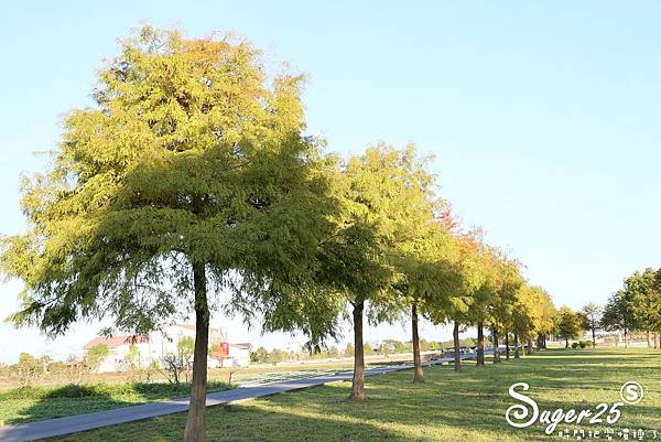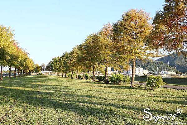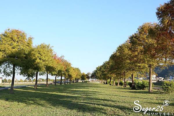 一整片兩排的落羽松,搭配中間的草地