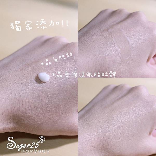很好推開~帶點水感的精華乳狀,有別以往傳統亮白產品偏乾的印象