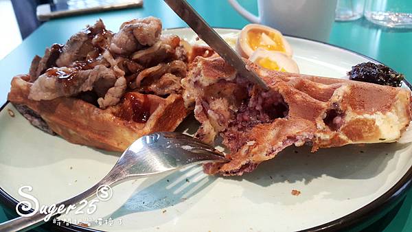 豬肉泡菜搭配鬆餅一口吃下去,讓人很滿足的咬下去~很豐富的口感