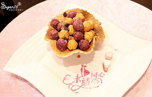 很少會有餐廳用紫色地瓜呈現這道料理,這邊以紫地瓜與黃地瓜去搭配點綴