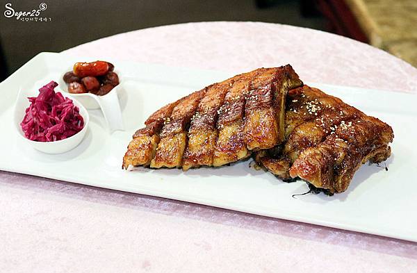肋排使用新鮮蔬菜洋蔥、西芹、紅蘿蔔打成汁&獨家秘方醬汁下去醃製,隔天再烤至金黃色澤