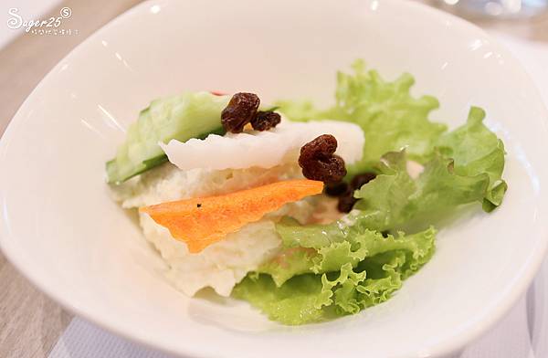 沙拉醬搭配沙拉還蠻好吃的,有小妞愛的葡萄乾,一球馬鈴薯泥