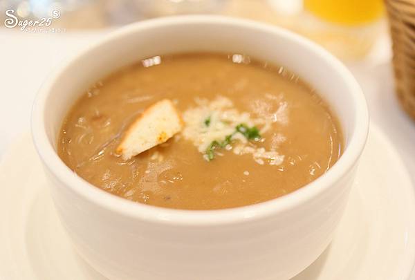 好像是洋蔥濃湯,上面還有一個麵包粒,我們很喜歡這濃湯
