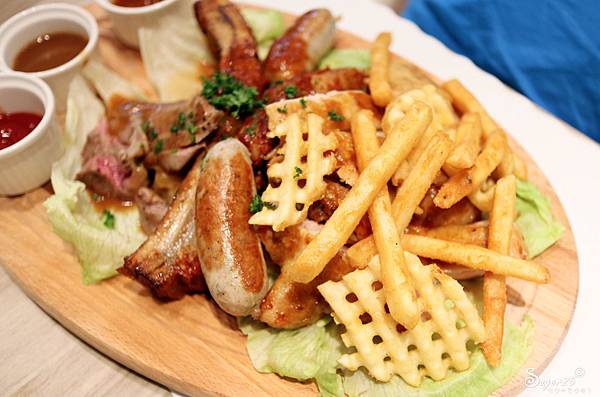 旁邊還有薯條、薯格格,有三種醬料去搭配不同的肉