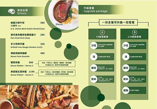 主餐+B餐 $139元 沙拉+濃湯+麵包+飲料+甜點