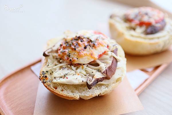 這樣兩個一份,分量還蠻足夠的,上面鋪上杏鮑菇、香菇、金針菇、番茄片,在敷上起司慢火烘烤