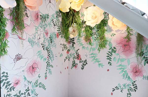 一樓有個拍照點,牆壁用彩繪花再用綠色植物去點綴,陽光自然豪邁的灑進來超美的