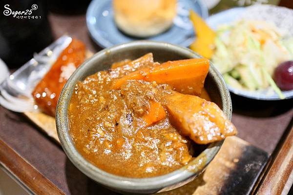 有野菜沙拉、湯品、手作麵包、紫米飯、茶碗蒸、特色咖哩醬、主菜、飲品