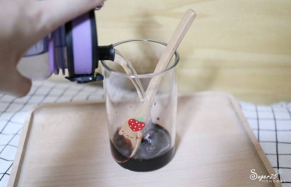 像小妞就是很不愛喝水的小孩,我就可以這樣調配成黑醋栗果汁給她喝