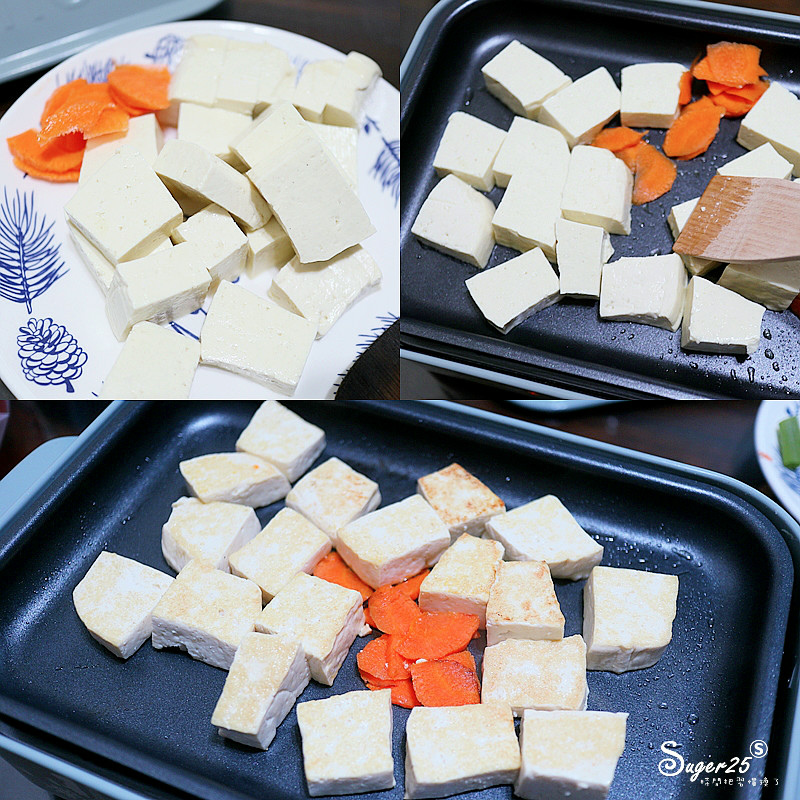 先刷油,放入豆腐&紅蘿蔔,煎到微焦在家入醬油起鍋即可