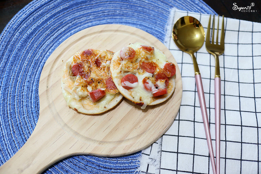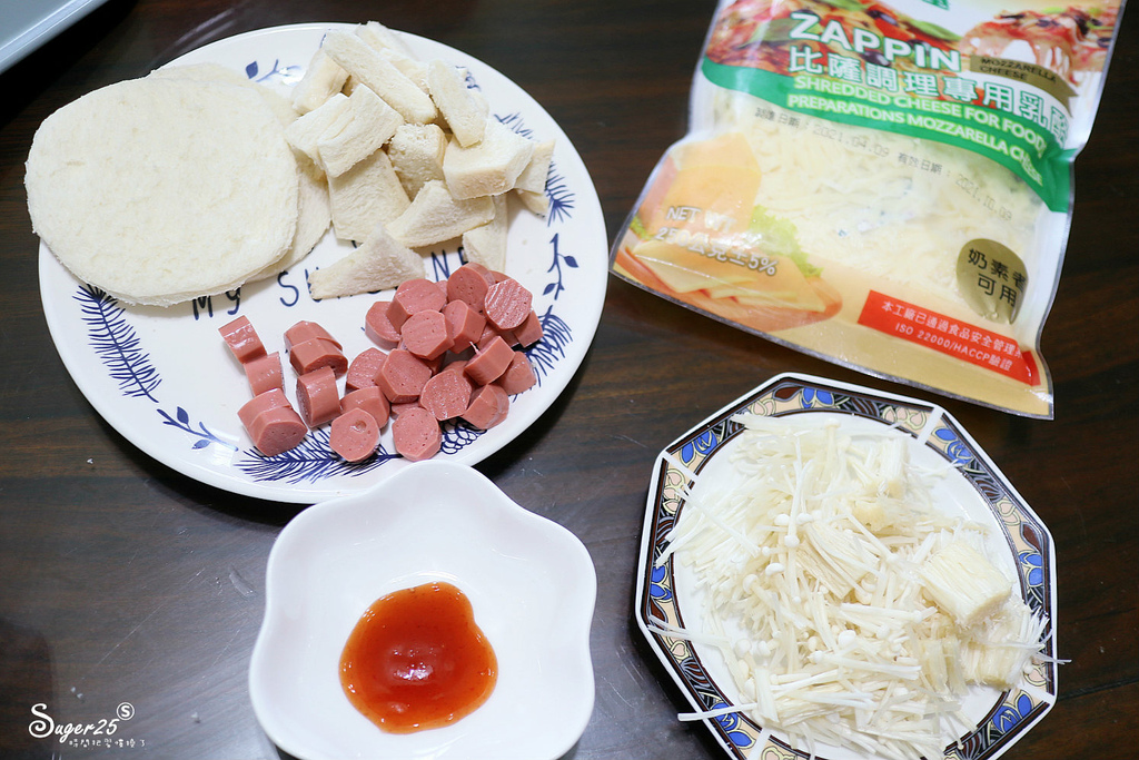 材料 : 吐司、熱狗、金針菇、披薩乳酪絲、甜辣醬、胡椒粉