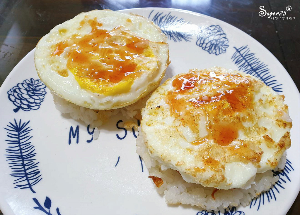 熱狗夾在蛋跟飯中間,撒上一點胡椒粉,蛋上面刷一點甜辣醬