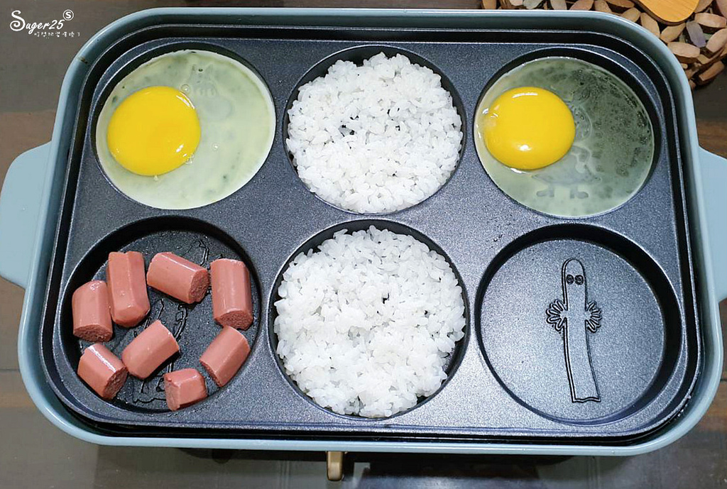 烤盤先刷油、放入飯、旁邊可以煎蛋、煎熱狗