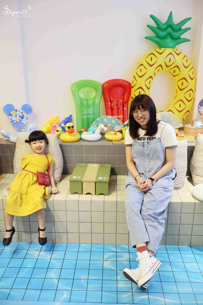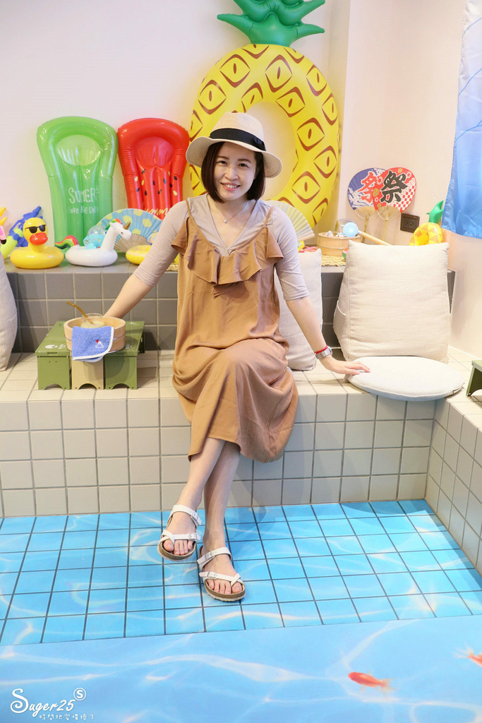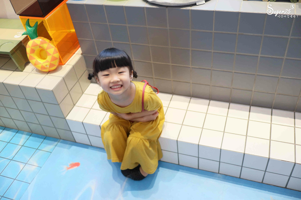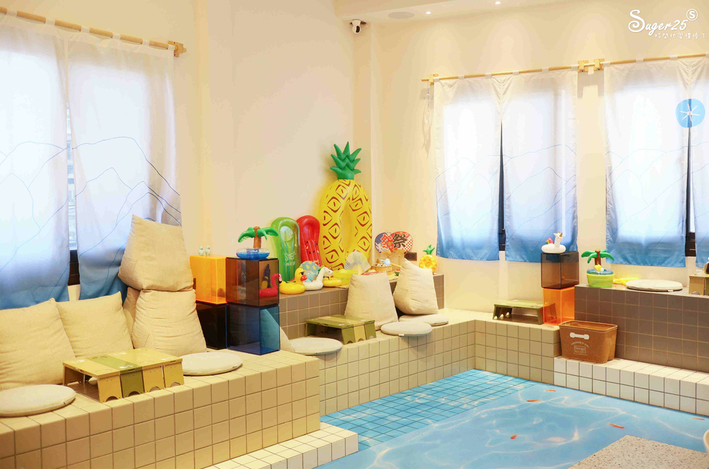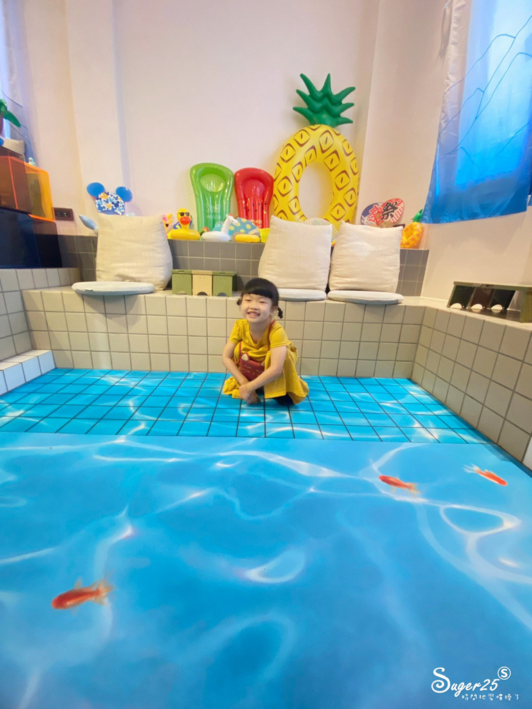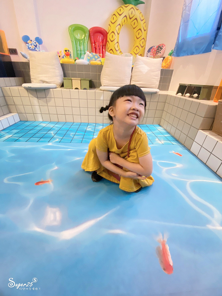 地板做成3D澡堂泳池,讓人看了也格外清涼,好像置身在泳池中
