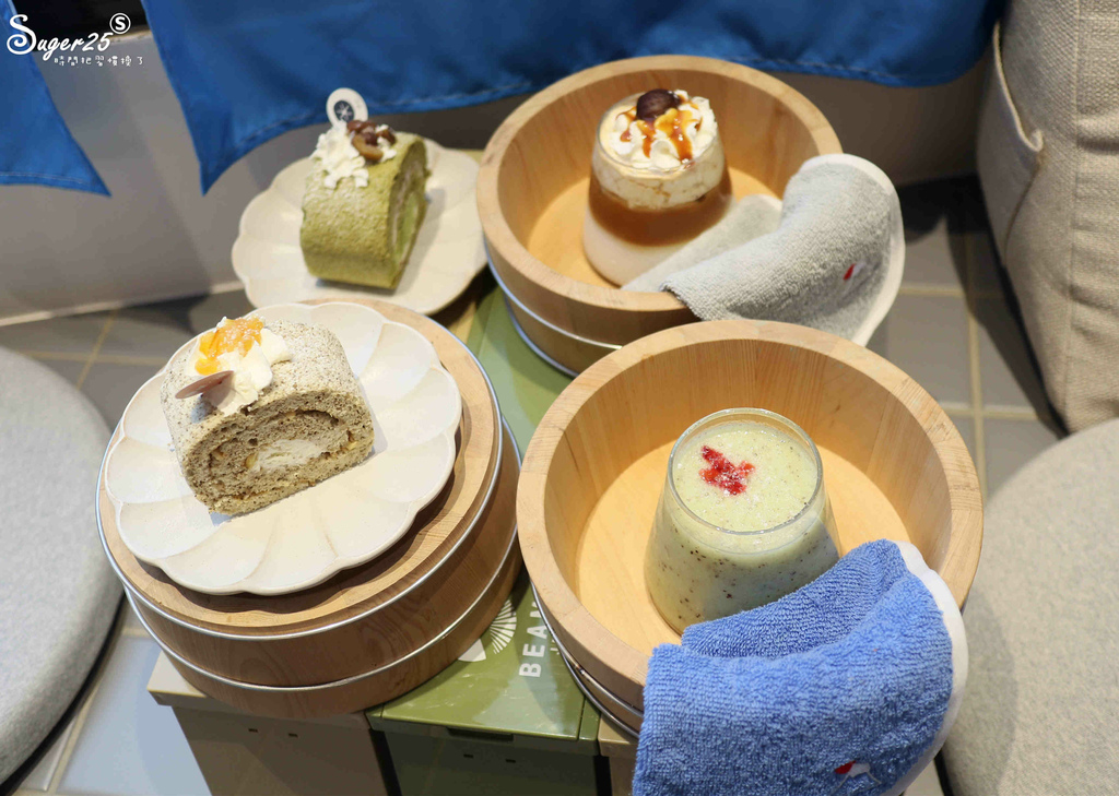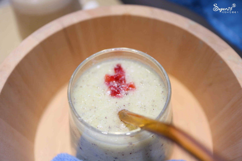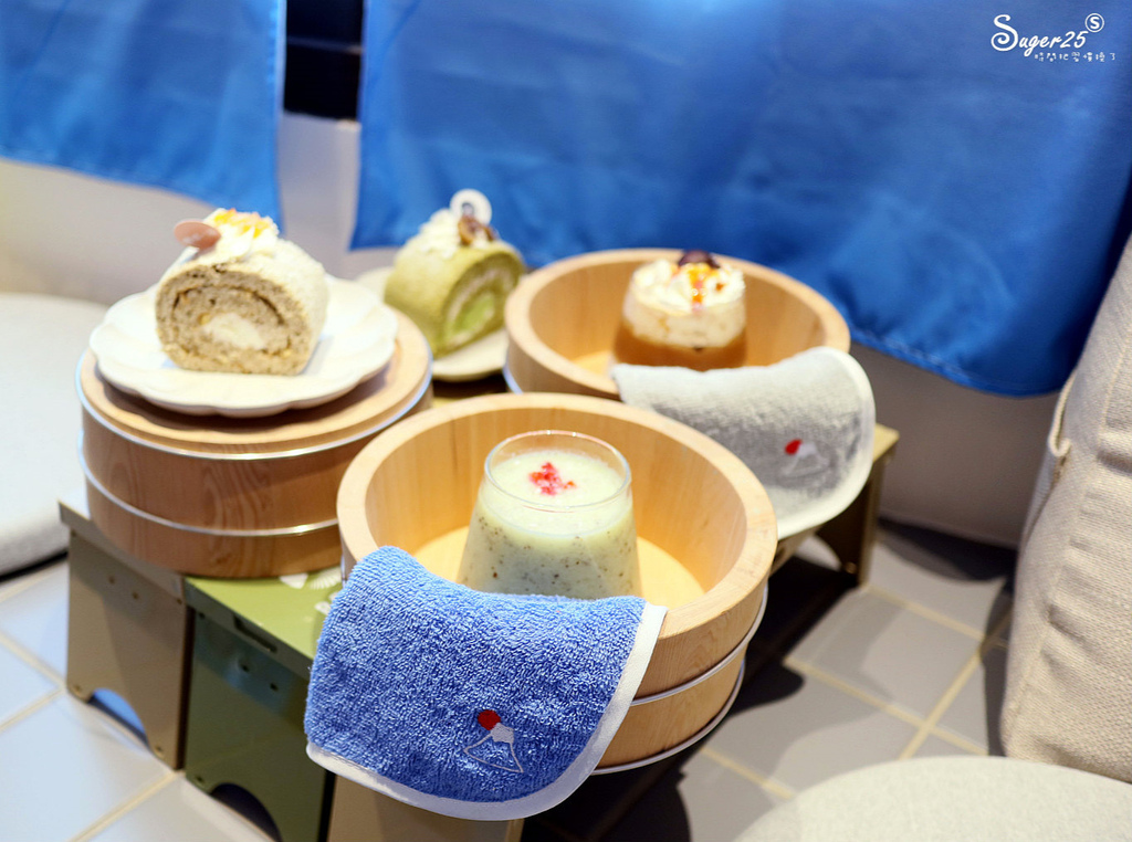 飲料放在小木盆中,還會擺上小毛巾,真的很有泡湯的氣氛