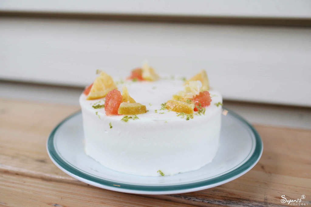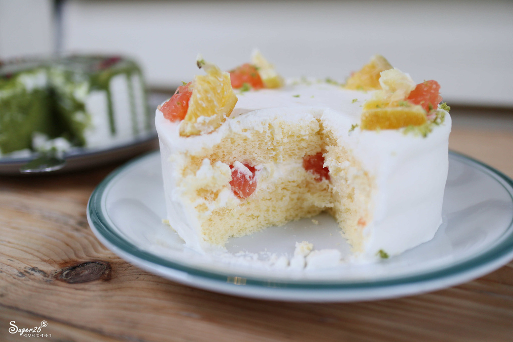 這個上面有葡萄柚、香橙果肉,檸檬皮撒在上面,蛋糕上層好像一幅畫,這點點綴好美