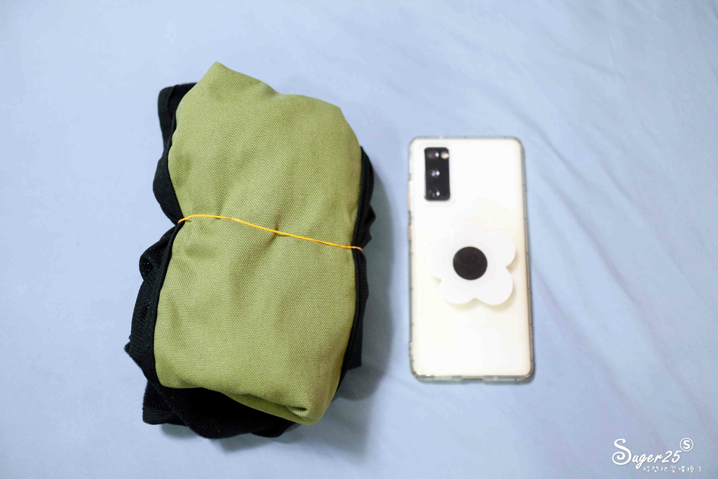 相當輕便好攜帶的嬰兒背巾,總重量不到250g,摺疊起來比手機大一點點而已,我直接用橡皮筋綁著收納