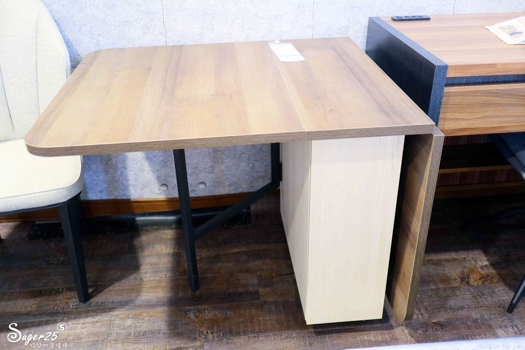 可摺疊起來的餐桌,要使用時再展開,平常沒用到或是只有少數人口,就摺疊起來使用
