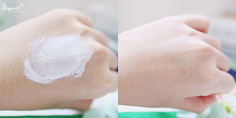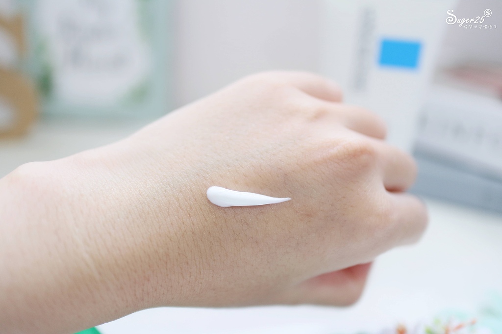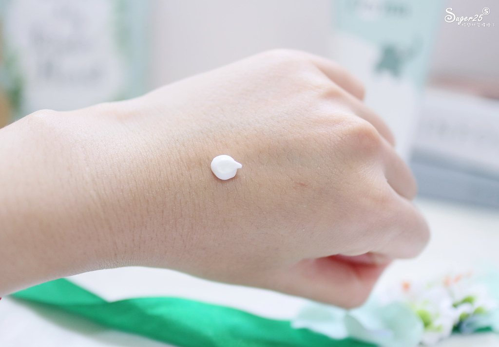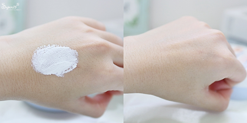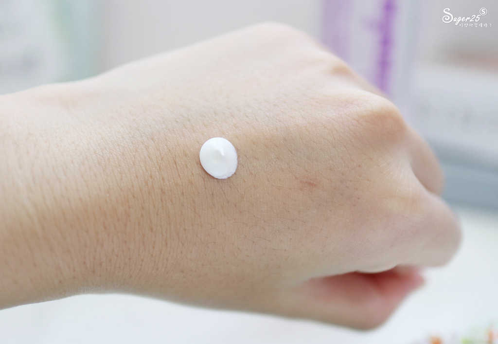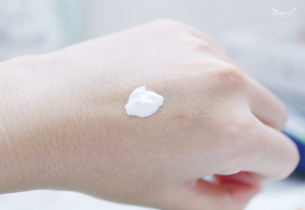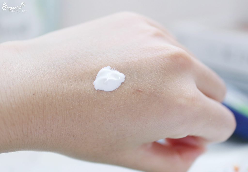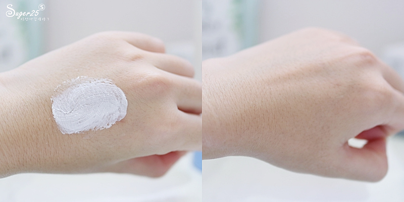 白色膏狀質地,本來想說膏狀會有點難使用,不過意外的好推開推勻,聞起來有點像是淡淡的寶寶味,淡淡的很好