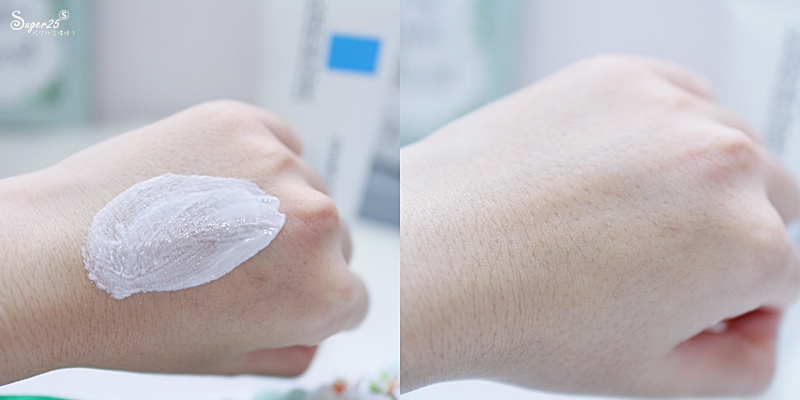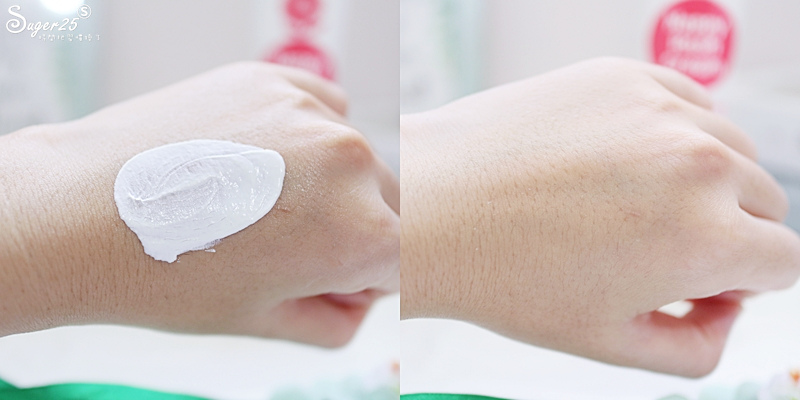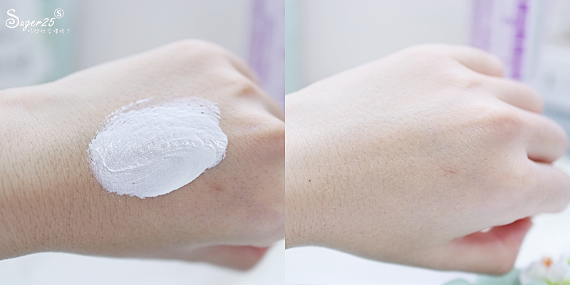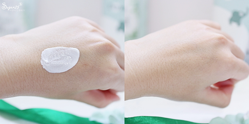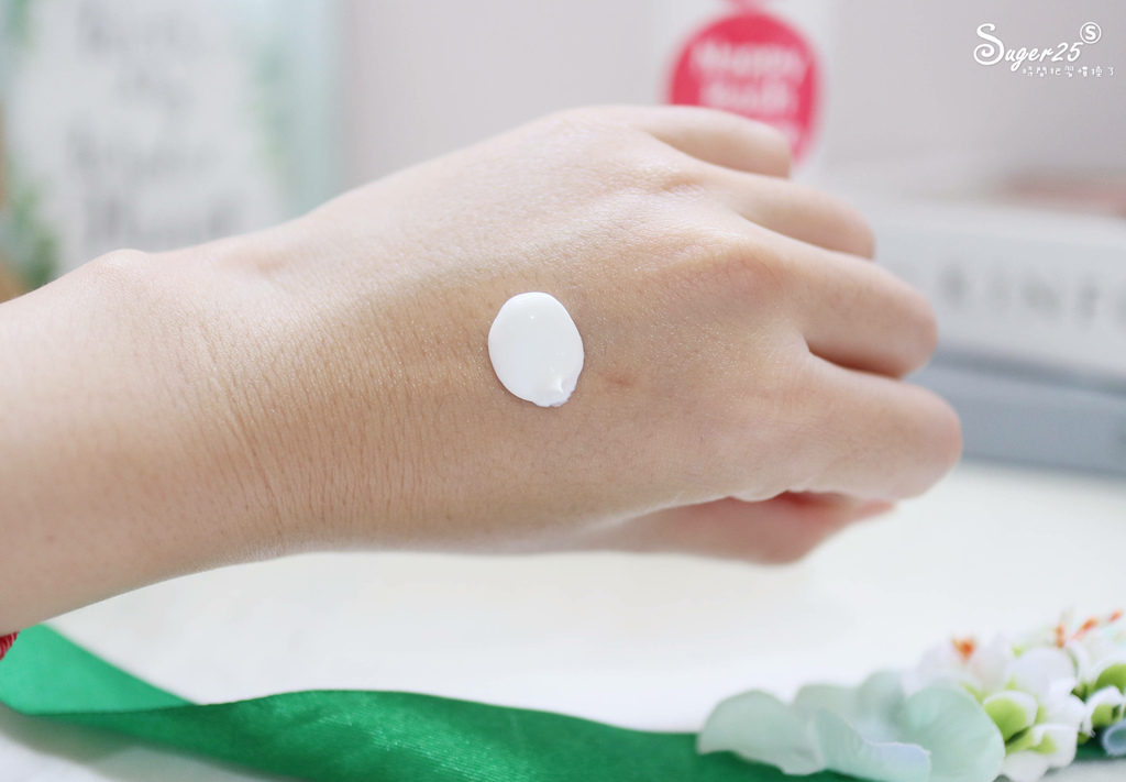 白色乳霜質地,蠻好推開的,有點界於乳液跟乳霜質地,推開形成一層保水膜,摸起來也是有點黏膩感,我不是很喜
