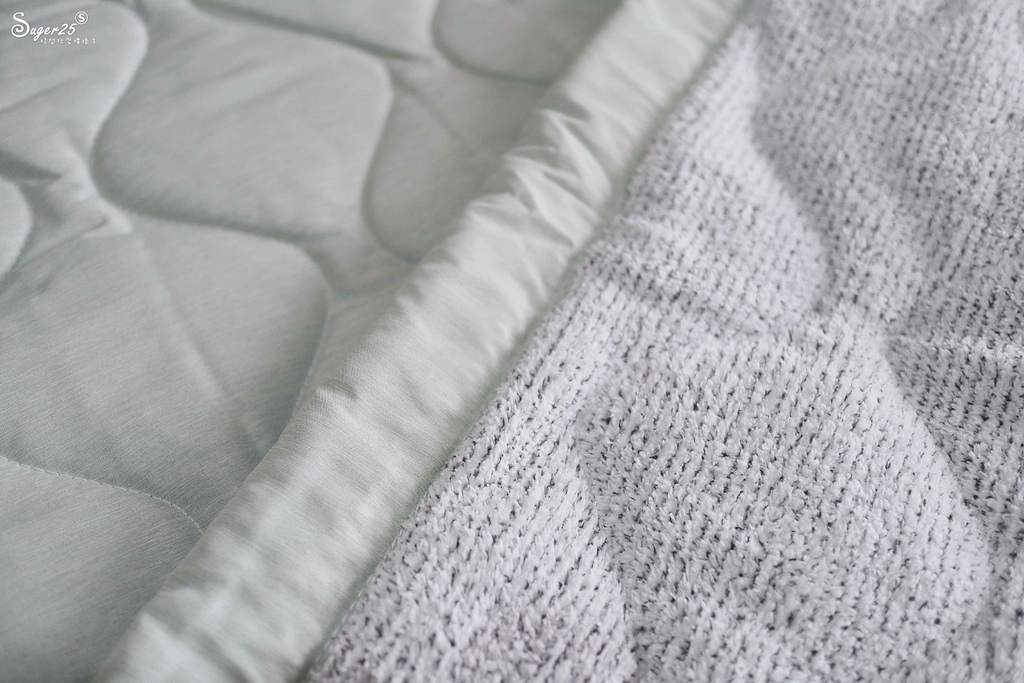 雙面結構,一面為石墨烯一面為馬卡龍綠,是我很愛的綠,搭家裡的床包也很好搭配