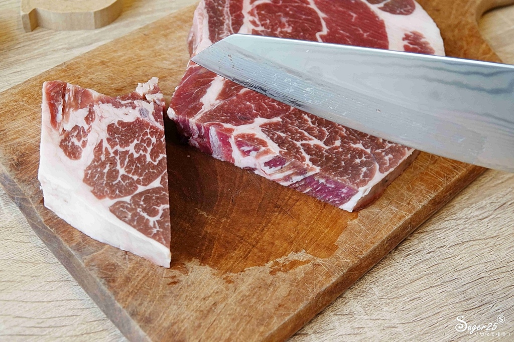 切超大塊牛排寬大的刀面下刀,好切又不會把肉切的碎碎醜醜的