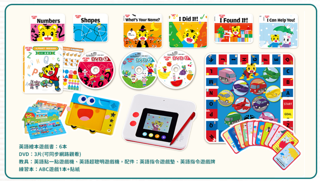 有6本英文繪本遊戲書、3片學習光碟、英語點一點遊戲機、英語超聰明遊戲機、ABC遊戲本+貼紙