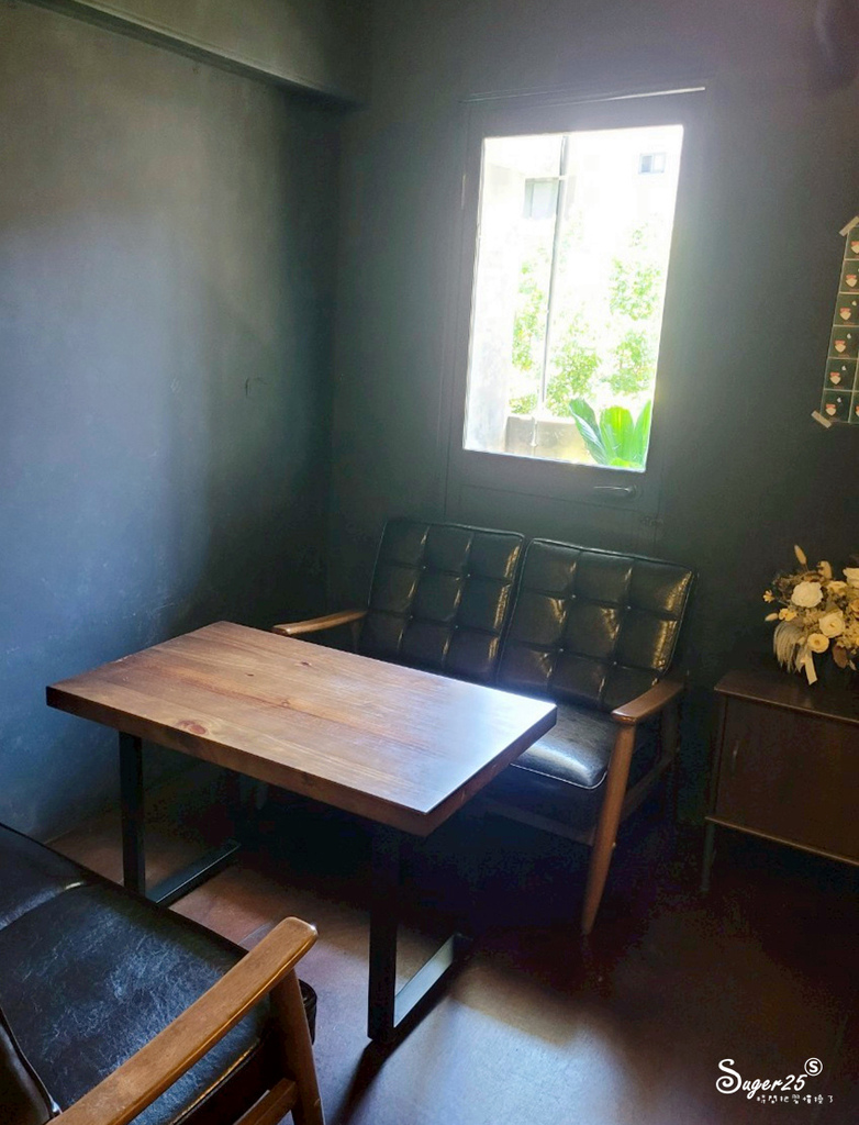 黑色皮沙發搭配木製桌子,很有質感又帶點復古的感覺