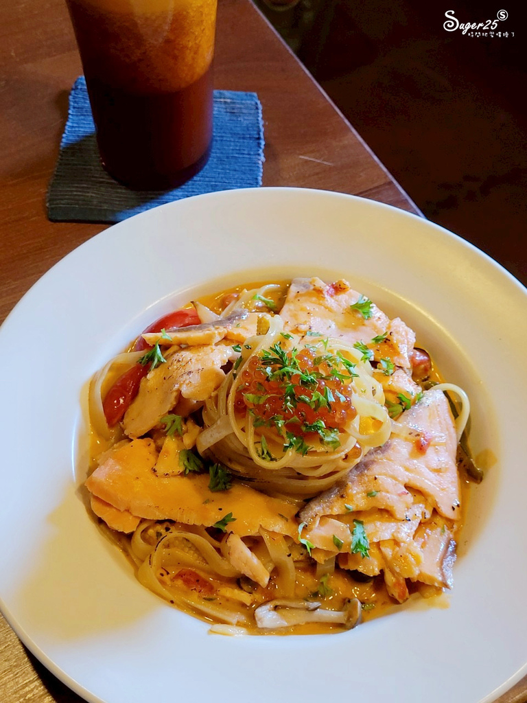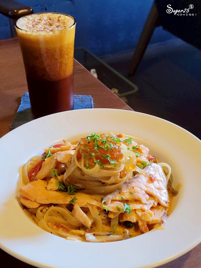 燻鮭魚很鮮料理的很好吃,寬麵口味比較淡,吃到後面有點膩口~小可惜