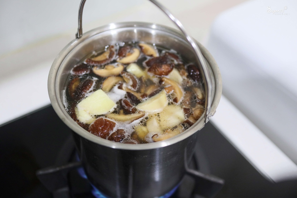 將薑片、蒜頭爆香後,加入水,加入泡好的香菇跟雞肉,雞肉有先川燙過