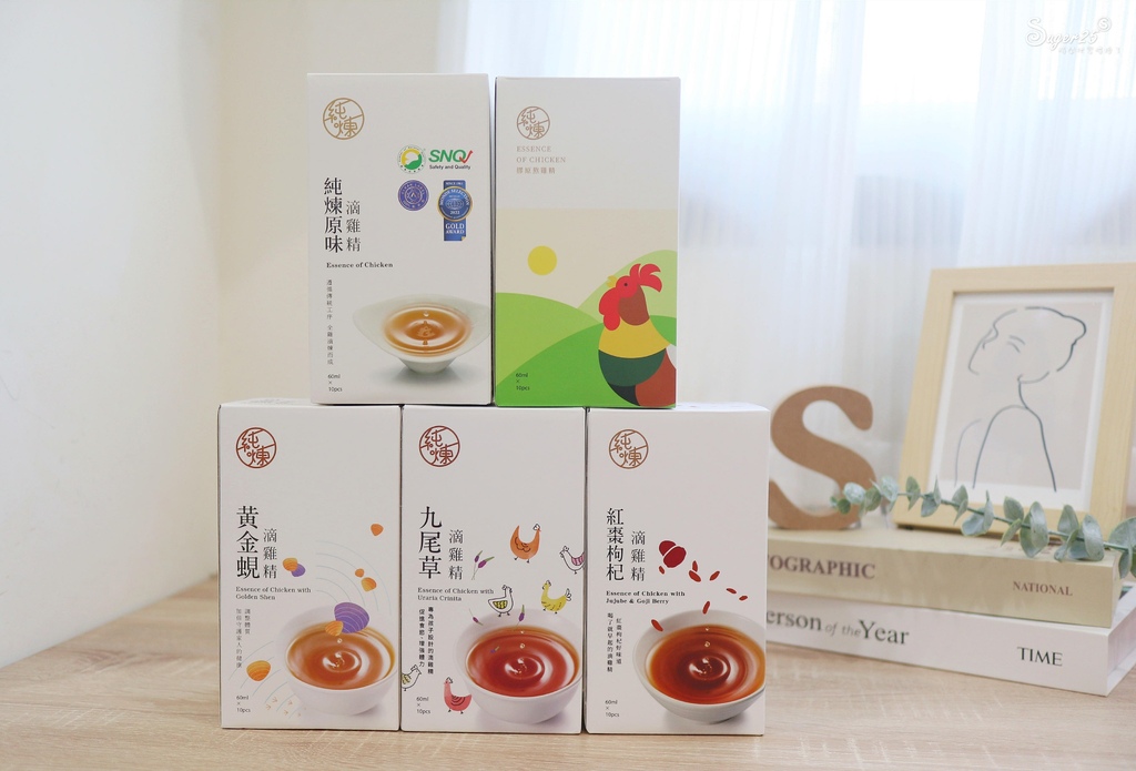 原味滴雞精、九尾草滴雞精、紅棗枸杞滴雞精、黃金蜆滴雞精、膠原熬雞精